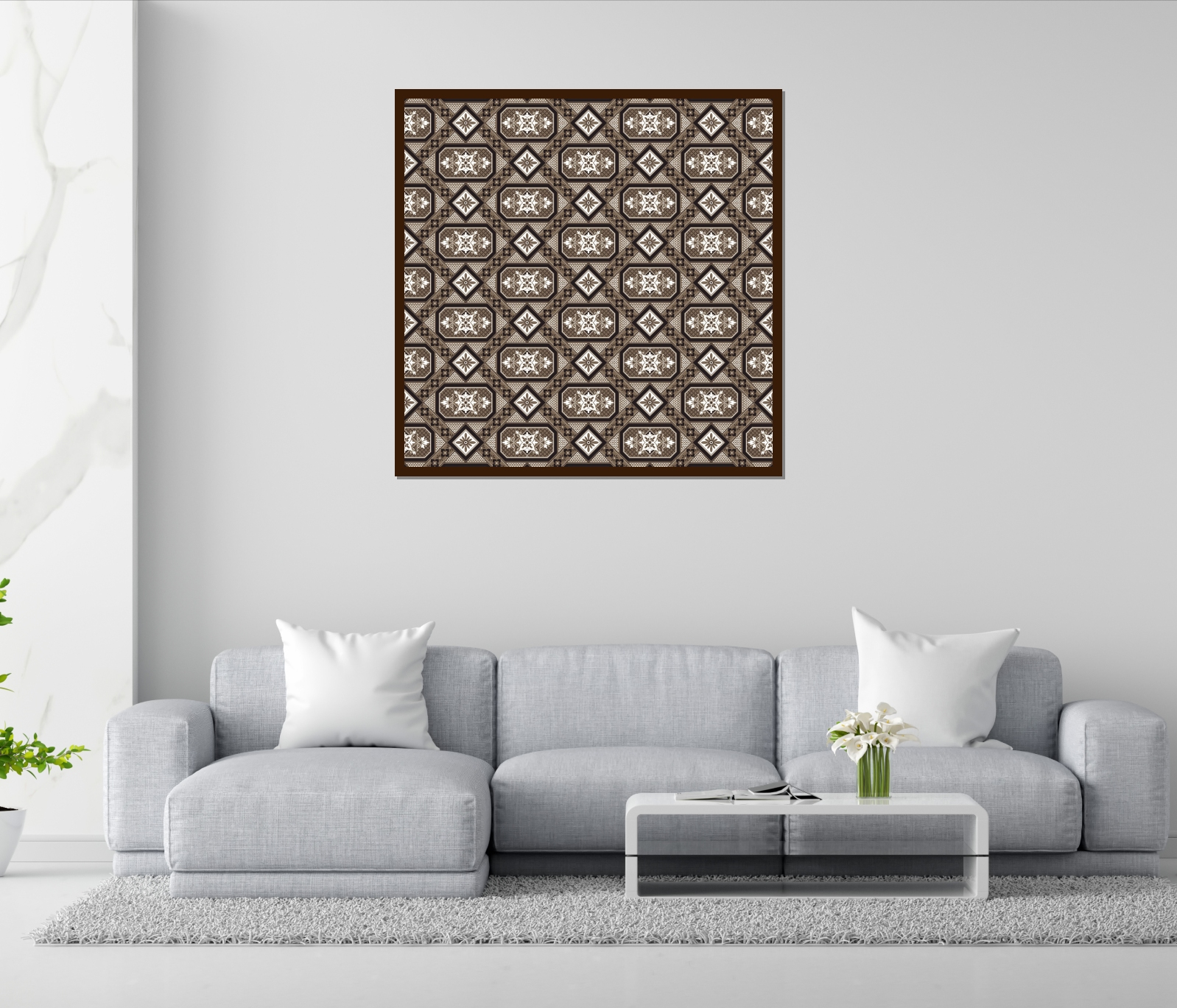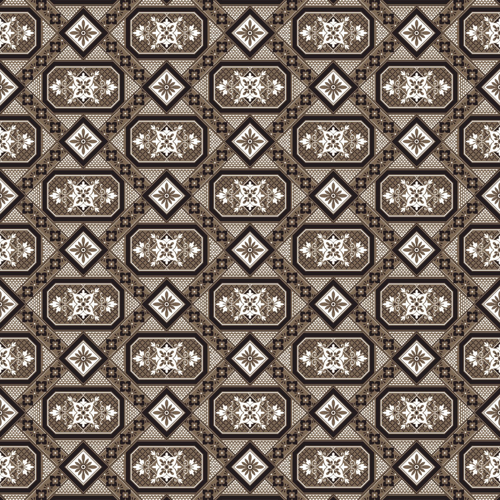 A stylish, tile-inspired pattern with octagonal medallions and diamonds creates a sense of order and rhythm. Warm coffee, cocoa, and cream tones with subtle black accents bring cozy luxury to the interior. Contrasting ornaments visually structure the wall, while fine details help conceal minor surface imperfections.